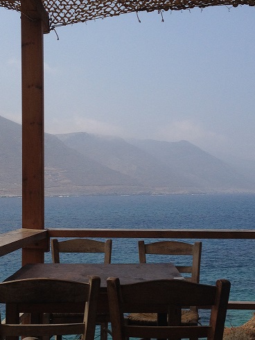 On y reviendra. Plus tard, pour vous parler de fava et de tonosalata. Aujourd’hui, je marche. Passe la première plage, celle de la taverne. Reprends un petit chemin qui semble monter trop haut – mais la côte est traîtresse – et conduit à la deuxième plage. Celle des campeurs. De l’autre côté de la baie on voit les tentes, points de couleur qui le soir, envoient un peu de lumière. Et la journée, sont juste posés sur le sable.
