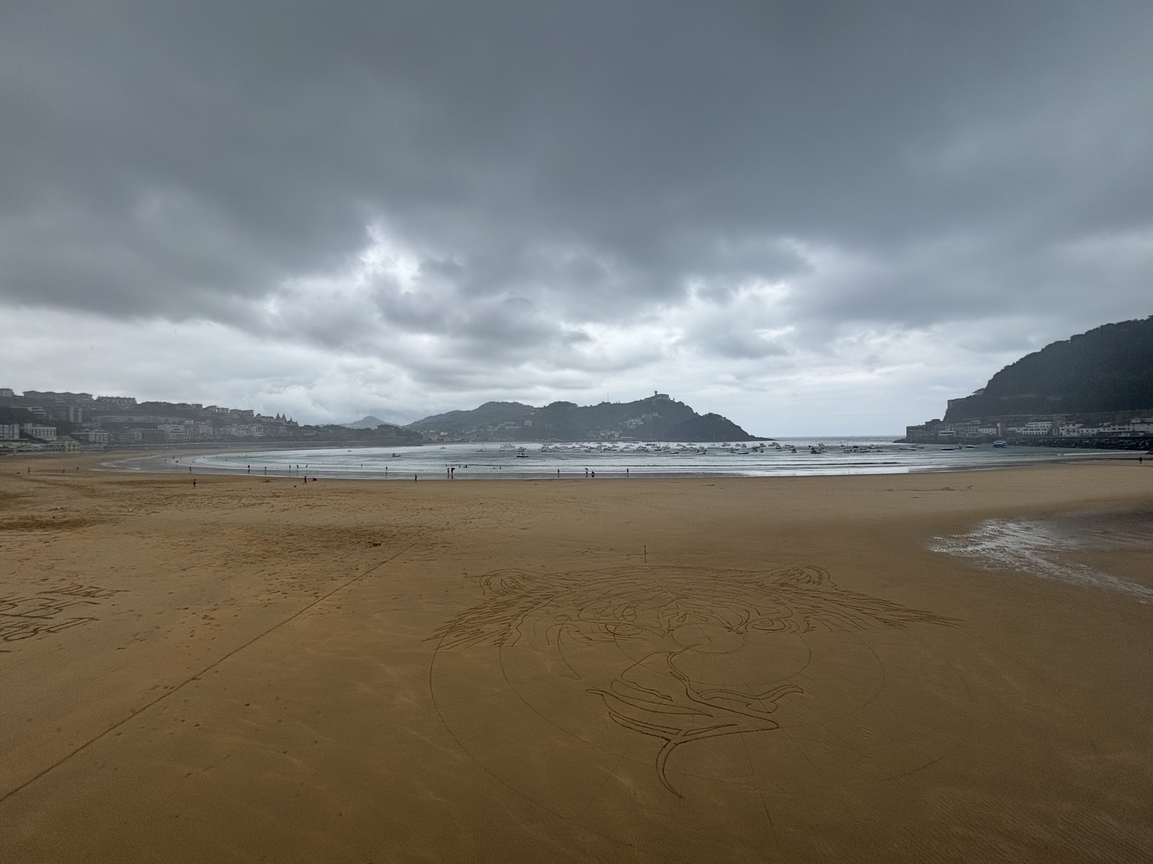 Ravalant alors mon humour graveleux, j’admire : la concha, hors de tout sous-entendu, est une baie. Mais majestueuse. Mais démesurée. Une baie à la forme du coquillage consubstantiel à mon périple du moment. Présentoir de Donostia, la concha nous accueille après une traversée humide et forestière en compagnie de pèlerins détrempés qui tous en chœur compostent leur ticket pour l’éternité.